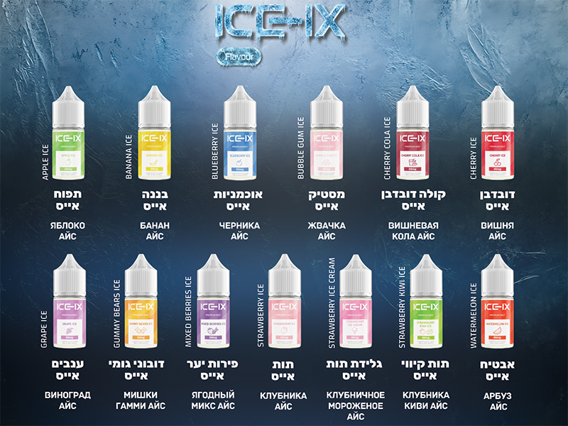 - IceIX Cherry Ice: טעם דובדבן מתוק וקפוא. פריך, מתוק ומרטיט.