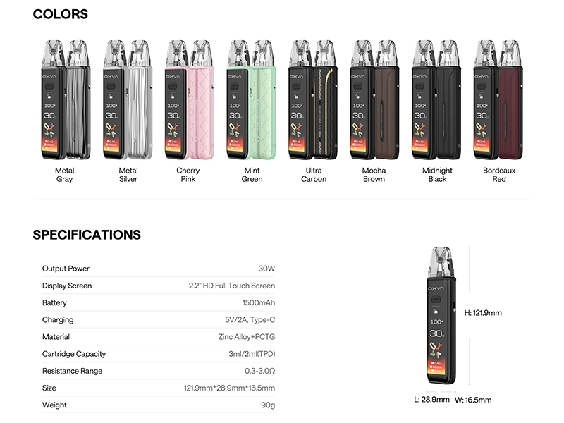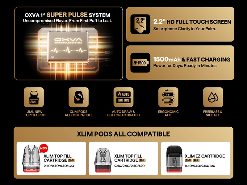 ה־OXVA Xlim 3 Ultra מציג עיצוב מתקדם וביצועים מרשימים במכשיר קטן ואלגנטי. מופעל באמצעות סוללה מובנית 1500mAh עם טעינת Type-C מהירה (80% תוך 30 דקות) ומספק עד 30W של עוצמה יציבה בזכות מערכת Super Pulse וטכנולוגיית UniTech 2.0 המעניקות טעם עשיר ועמידות ארוכה יותר למחסניות.