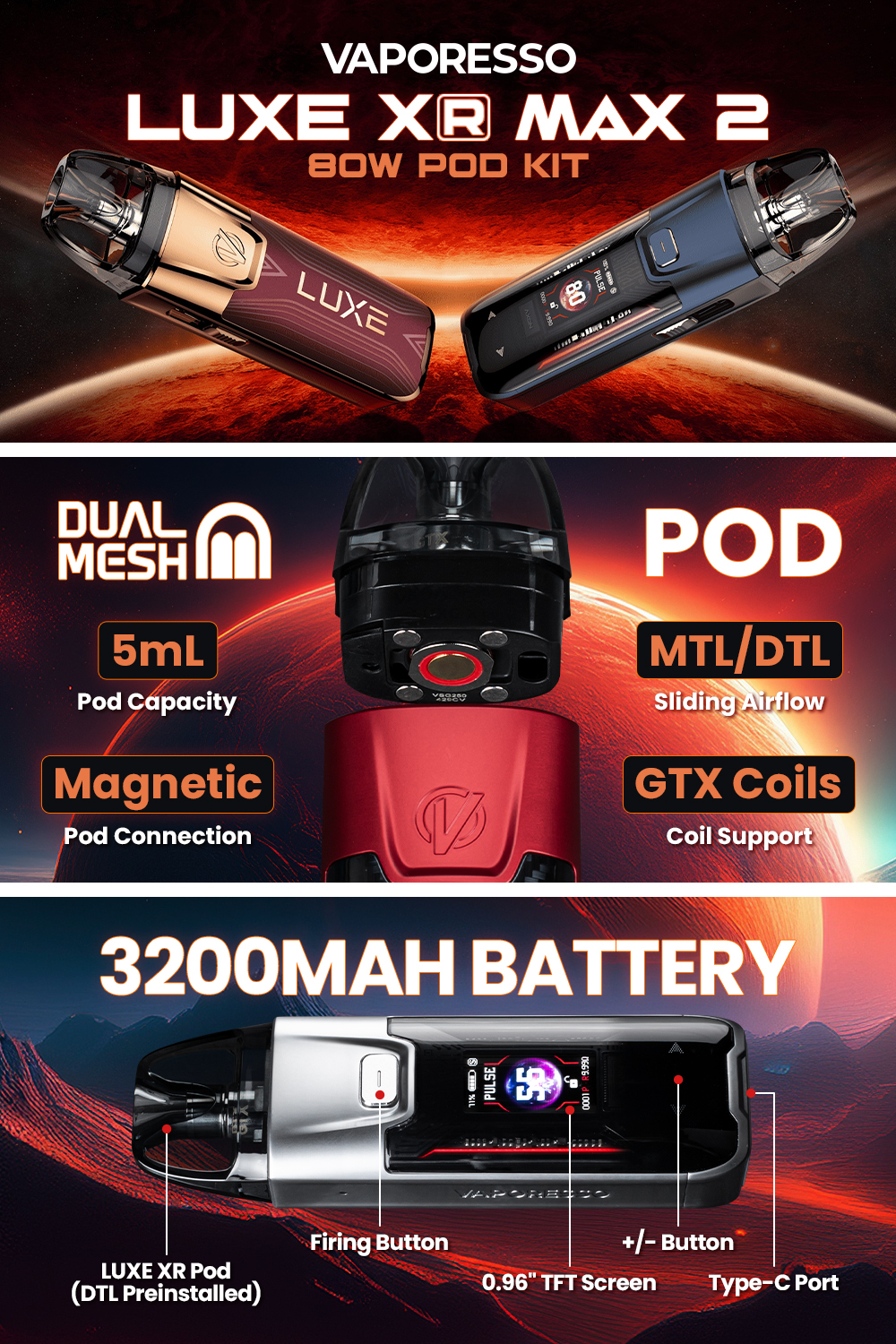 ערכת הפוד החדשה Vaporesso LUXE XR MAX 2 כוללת סוללה עוצמתית בקיבולת 3200mAh, טווח הספק של 5–80W, תאורת RGB, מצב Pulse וסלילי GTX Mesh חדשים. עם סוללה סופר עוצמתית בקיבולת 3200mAh, ה-LUXE XR MAX 2 מספק עוצמה מרשימה ומגיע עד 80W בעבודה מלאה. המכשיר מצויד במתג נעילה תחתון ובבסיס סיליקון מגן, ומתמקד באספקת חוויית אידוי בטוחה וטעם עשיר במיוחד.