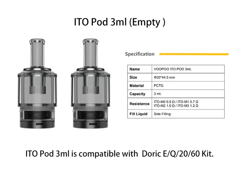 Updated new ITO Pod 3ml is compatible with Doric E/Q/20/60 Kit. ITO POD 3mL supports ITO series coils.